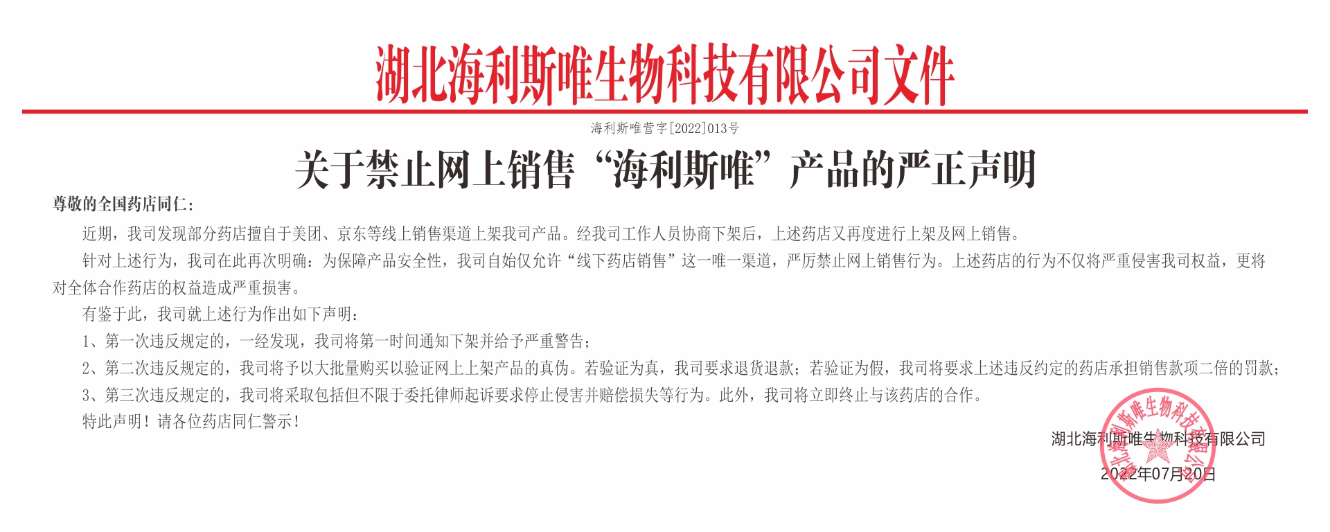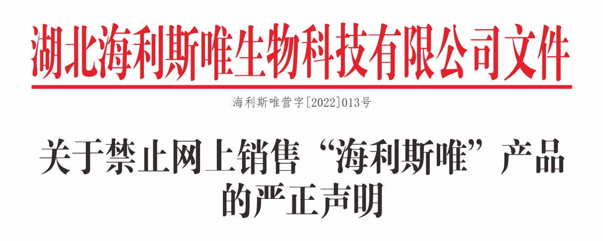 關(guān)于禁止網(wǎng)上銷(xiāo)售"海利斯唯"產(chǎn)品的嚴(yán)正聲明